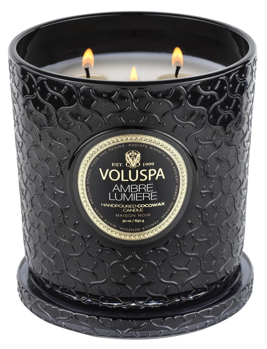 Voluspa Ambre Lumiere Luxe Candle: The aromatic radiance of this timeless scent instills a sense of calm, welcome and wellbeing. Reflect warmth in home and in spirit with Ambre Lumiere’s mystical, meditative blend – based on ancient amber incense, precious ceremonial burning wood, ground spices, pods and resins. Arouse the senses and soothe the soul.