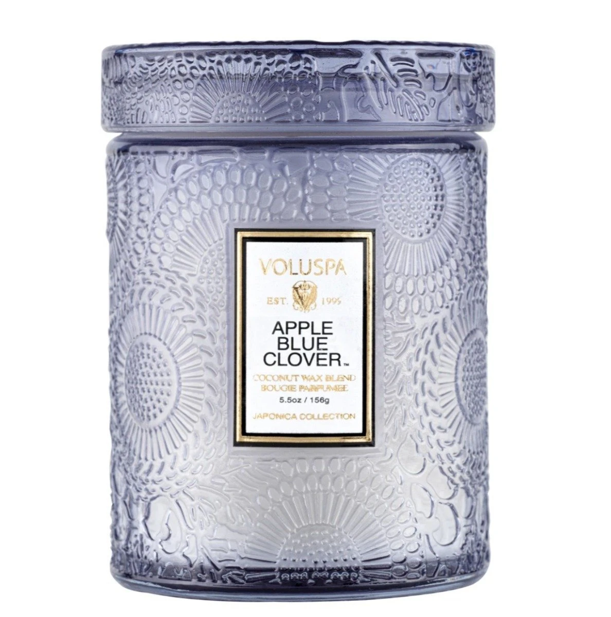 Voluspa Apple Blue Clover Embossed Small Glass Candle: at sunrise, fresh Clover springs from morning grass while Violet emerges to meet it. Collectively breathing and sighing with spring’s freshness, Roses, Lily of the Valley, Cucumber, Jasmine and Melon blossom at once to create an extraordinary bouquet.