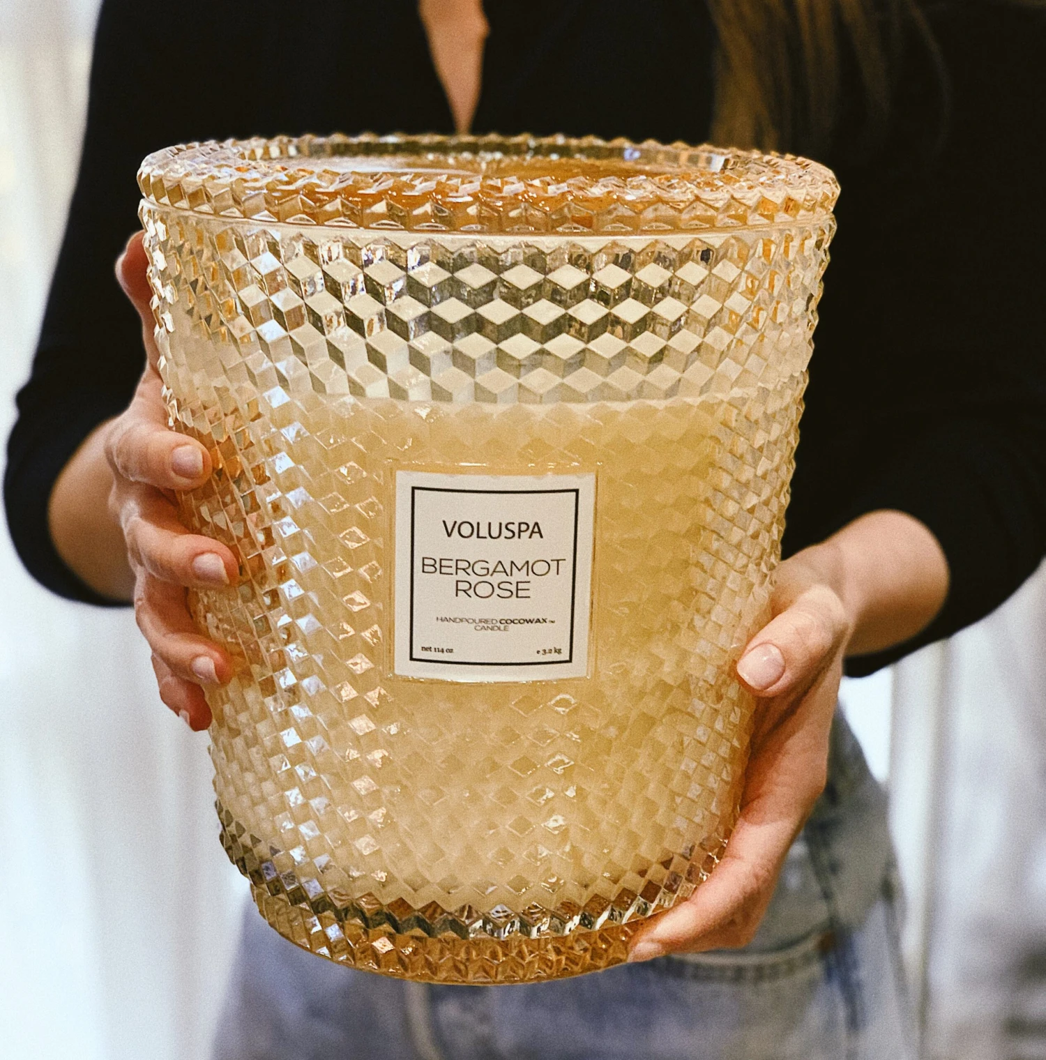Voluspa’s unique coconut wax blend is hand-poured into a 114 oz. embossed glass vessel and topped with a matching lid that keeps the candle dust-free when not in use. Our five wicks allow you to enjoy fragrance throw for 200 hours. Our candles are hand-poured in the United States and feature our proprietary, clean-burning coconut wax blend and 100% natural wicks. Our products are free of phthalates, pesticides, parabens and sulfates and are never tested on animals. Up-cycle this best seller into a keepsake after the last burn.