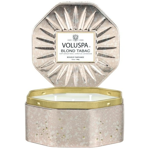 Voluspa Blond Tabac Octagon Tin Candle: Enter the drawing room of contentment with a scent of subtle elegance, reminiscent of tweed smoking jackets and smooth Perique pipe Tobacco. Vanilla Husk curls through Sandalwood panelled club rooms, mellowed by years of pleasure. This isn’t a pipe dream, it’s an invitation to breathe deeply and join the club of this richly storied scent.