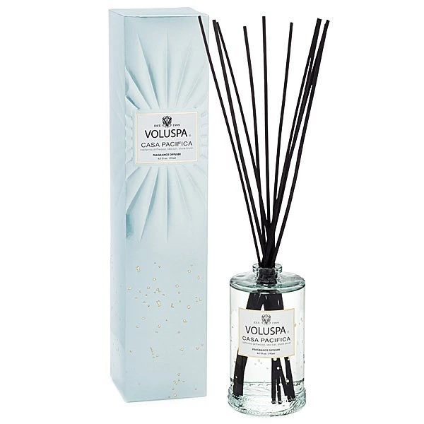 Voluspa Casa Pacifica Diffuser: Under a cloudless, sunny, blue sky, waves roll in and out along a seemingly endless shoreline. Surfers glide into shore effortlessly. A gentle marine breeze fills the wide-open windows of a small beach house and caresses it with the scent of Sea Salt, California Driftwood and Shore Brush. Get a California beach house vibe anytime, anywhere- feel the sand in your toes and breeze in your hair. Hold the candle to your ear, listen carefully- and you just might hear the tide rolling in…