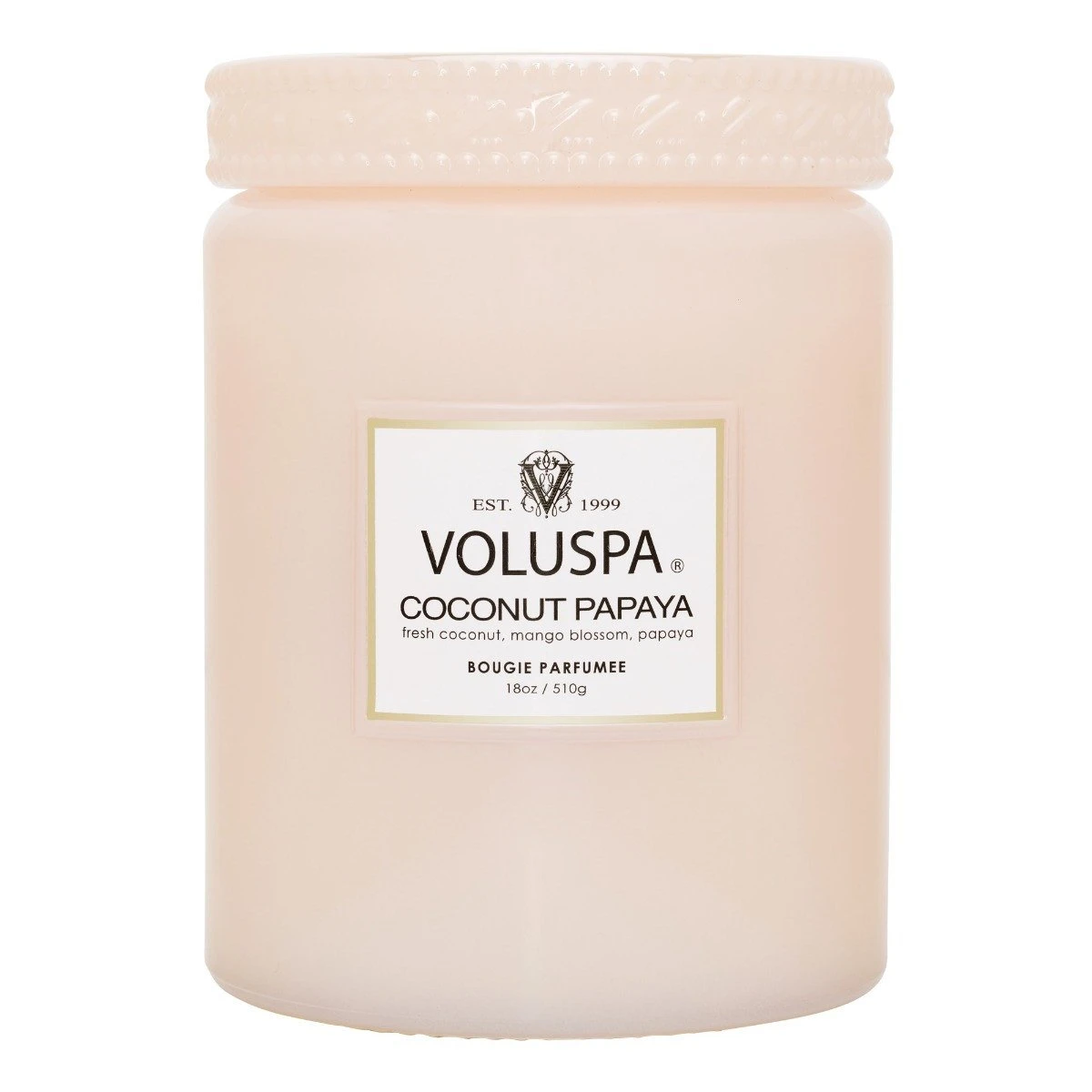 Voluspa Coconut Papaya Candle: Seek refuge from an unrelenting heatwave with this concoction of pulpy, sweet papaya, young white peaches and tropical fruit. Served almost frozen in the husk of a coconut shell, surrounded by tropical flowers, sweetly perfuming every icy sip.