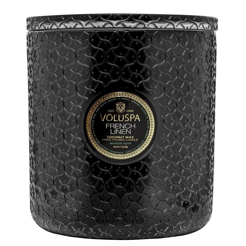 Voluspa French Linen 5 Wick Hearth Candle: prepare to be entranced by this fragrant reverie, inspired by drifting into slumber in freshly washed linen sheets dried by the sun’s rays and air tumbled by a gentle breeze. Slip into a tranquil halo of Solar Amber, Cotton Flower, Sun Dried Vanilla Bean with Citrus Peel and White Cedar. Wash away your cares by this fragrant daydream.