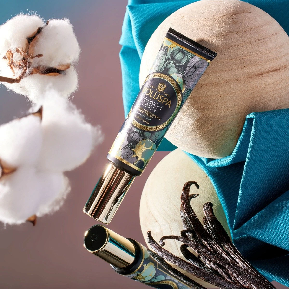 Voluspa French Linen Luxe Hand Cream: prepare to be entranced by this fragrant reverie, inspired by drifting into slumber in freshly washed linen sheets dried by the sun’s rays and air tumbled by a gentle breeze. Slip into a tranquil halo of Solar Amber, Cotton Flower, Sun Dried Vanilla Bean with Citrus Peel and White Cedar. Wash away your cares by this fragrant daydream.