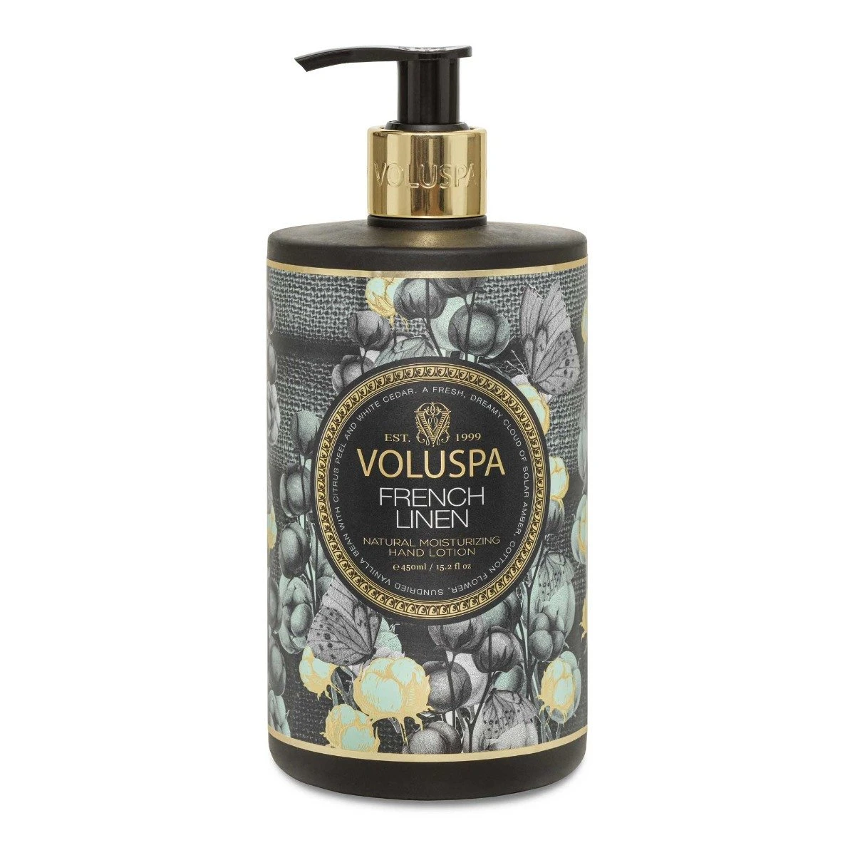 Voluspa’s Moisturizing Hand Lotion is highly covetable with its elegant frosted soft-touch finished bottle, wrapped in classic black or white Maison artwork. Pops of distinctive secondary color highlights are coupled with accents of muted gold. An added touch of luxury is also present in the custom logo, embossed on chrome gold collars on all bottle necks. Each bottle is custom designed in-house and created with Post-Consumer Recycled material. The perfect balance of beauty and function, from our house to your home. Vegan. Free of phthalates, pesticides, parabens and sulfates. Coconut Water, Coconut Oil,  Sunflower Seed Oil, Aloe Vera.