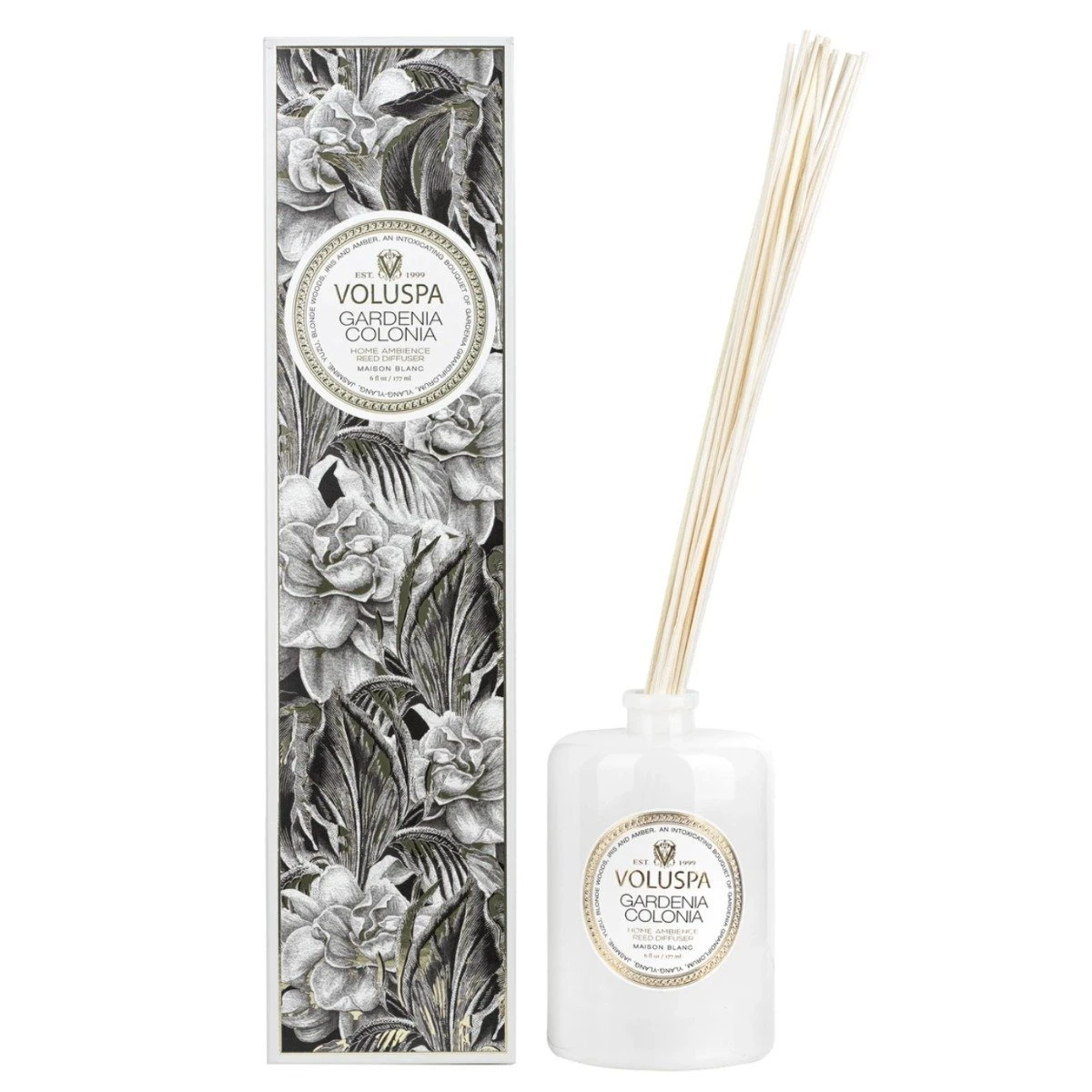 Voluspa Gardenia Colonia Diffuser:Â Heady, exotic gardenia grandiflorum opens its creamy petals of wild hearts to night blooming jasmine and iris. Vapors of blonde wood and amber mingle with this intoxicating floral bouquet – creating a sultry, fragrant cloud so smooth, the beauty and power of its velvety aroma seems dreamlike.