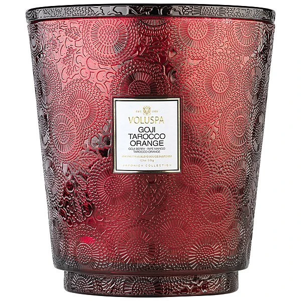 Voluspa Goji & Tarocco Orange 5 Wick Hearth Candle is best described as: Goji berries grow on an evergreen shrub found in temperate and subtropical regions in China, Mongolia and in the Himalayas in Tibet. Goji berries are usually found dried and are shriveled red berries that resemble red raisins. Tarocco (also know as “Blood Orange” and “Red Orange”), means “beautiful” in Sicilian dialect. Goji berry, ripe mango and Tarocco orange are the main exotic ingredients involved. Bring home a Goji Tarocoo Orange Candle today!
