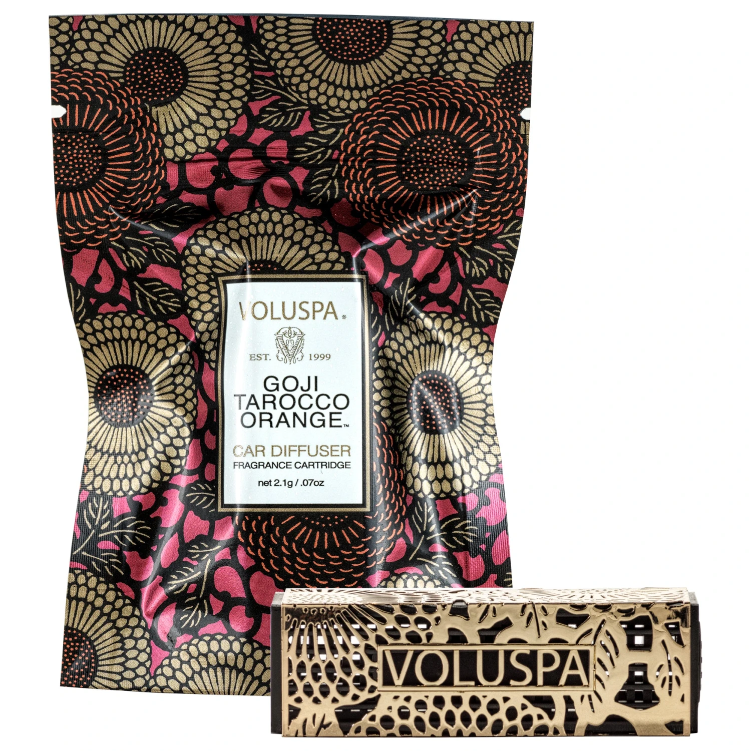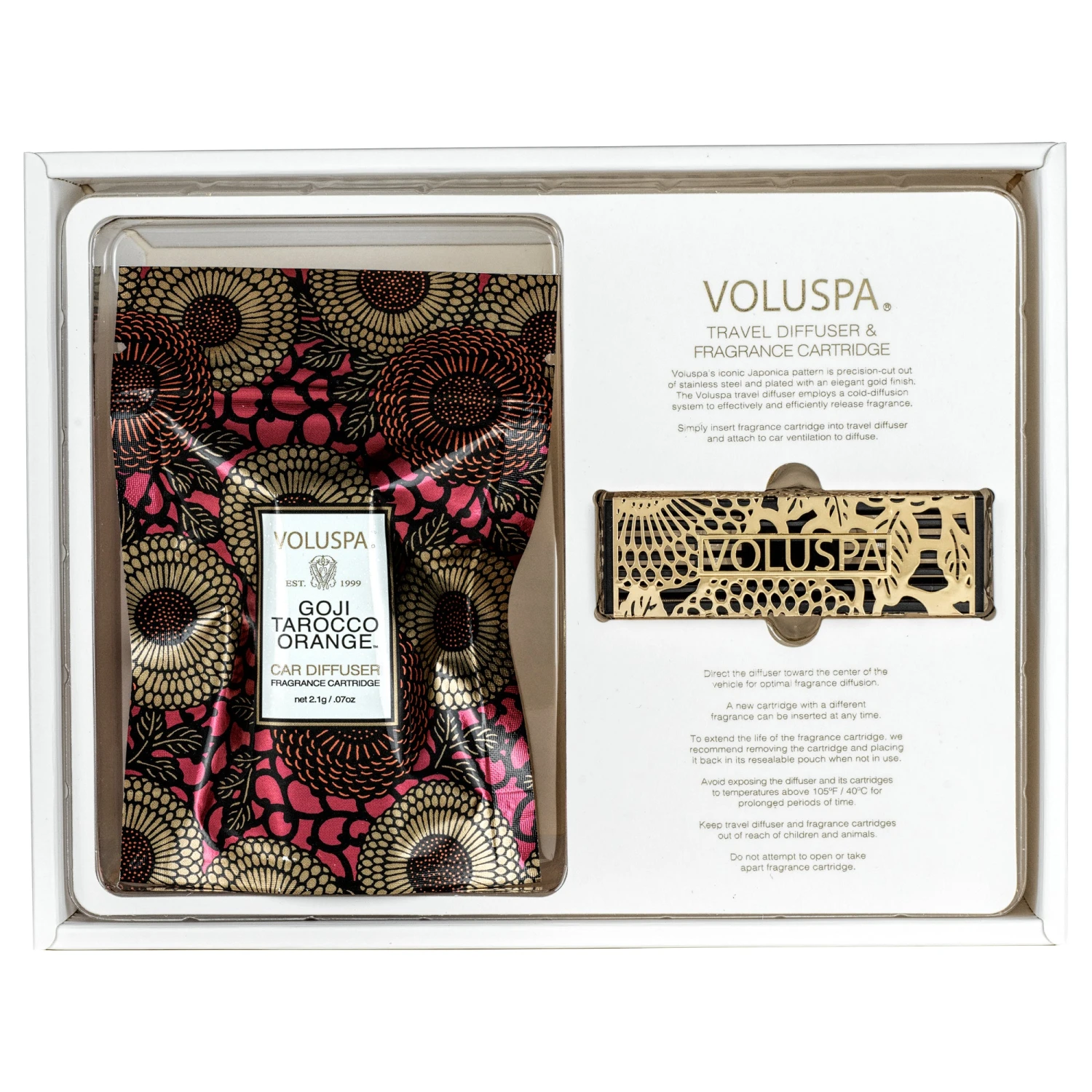 Voluspa’s iconic Japonica pattern is precision-cut out of stainless steel and plated with an elegant gold finish. The Voluspa travel diffuser employs a cold-diffusion system to effectively and efficiently release fragrance.