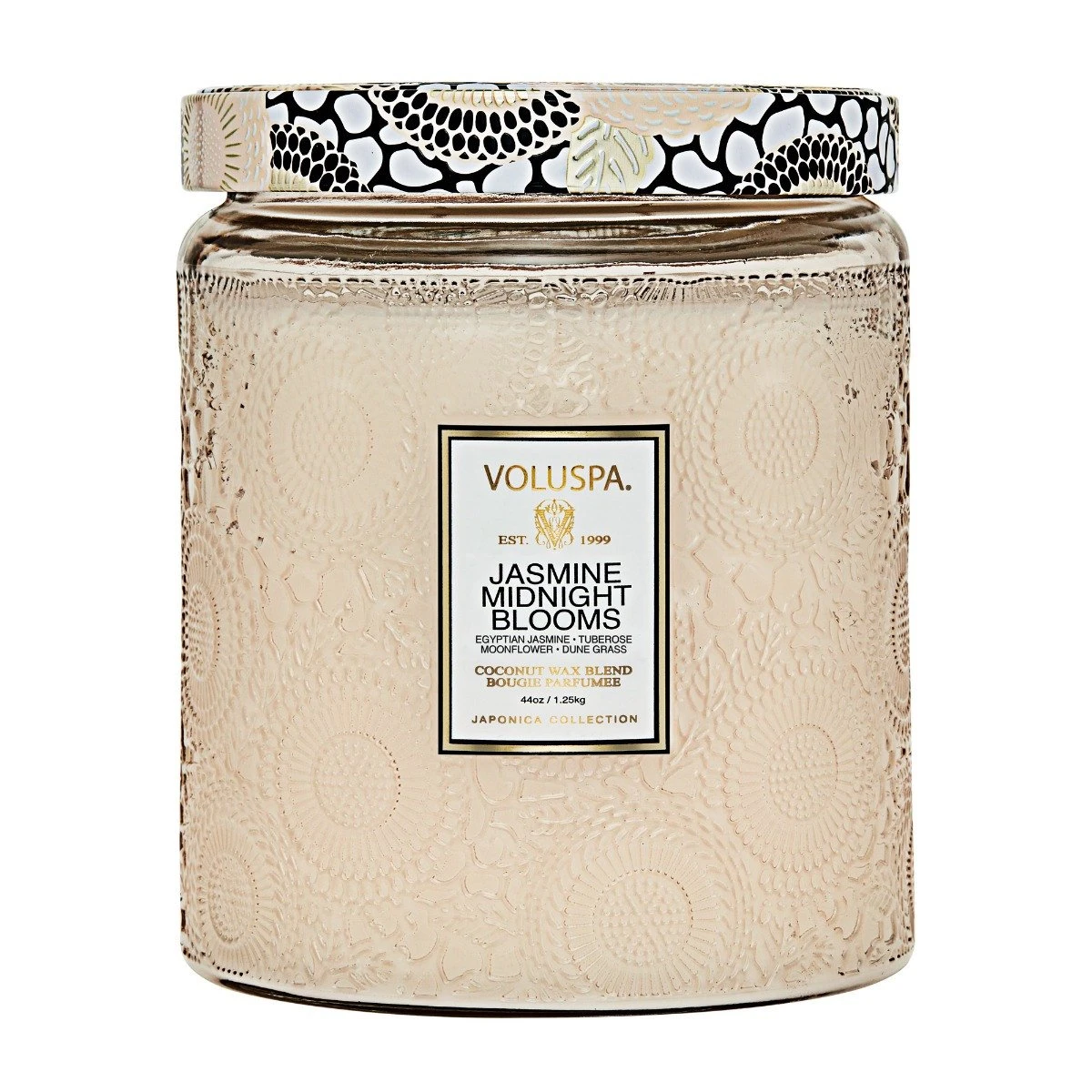Voluspa Voluspa Jasmine Midnight Blooms Luxe Candle: The rising moon awakens the blooms from their slumber with spells of Italian Bergamot and Moonflower. Arousing notes of Egyptian jasmine and tuberose overtake the senses, illuminating their long stems and arching petals. Blossoming with a bravado of dune grass and mango wood, the ladies of the night arrive in full bloom, sending fragrance throughout the night air like sweet secrets kissing the ear. A bold fragrance, as intense as its beauty.
