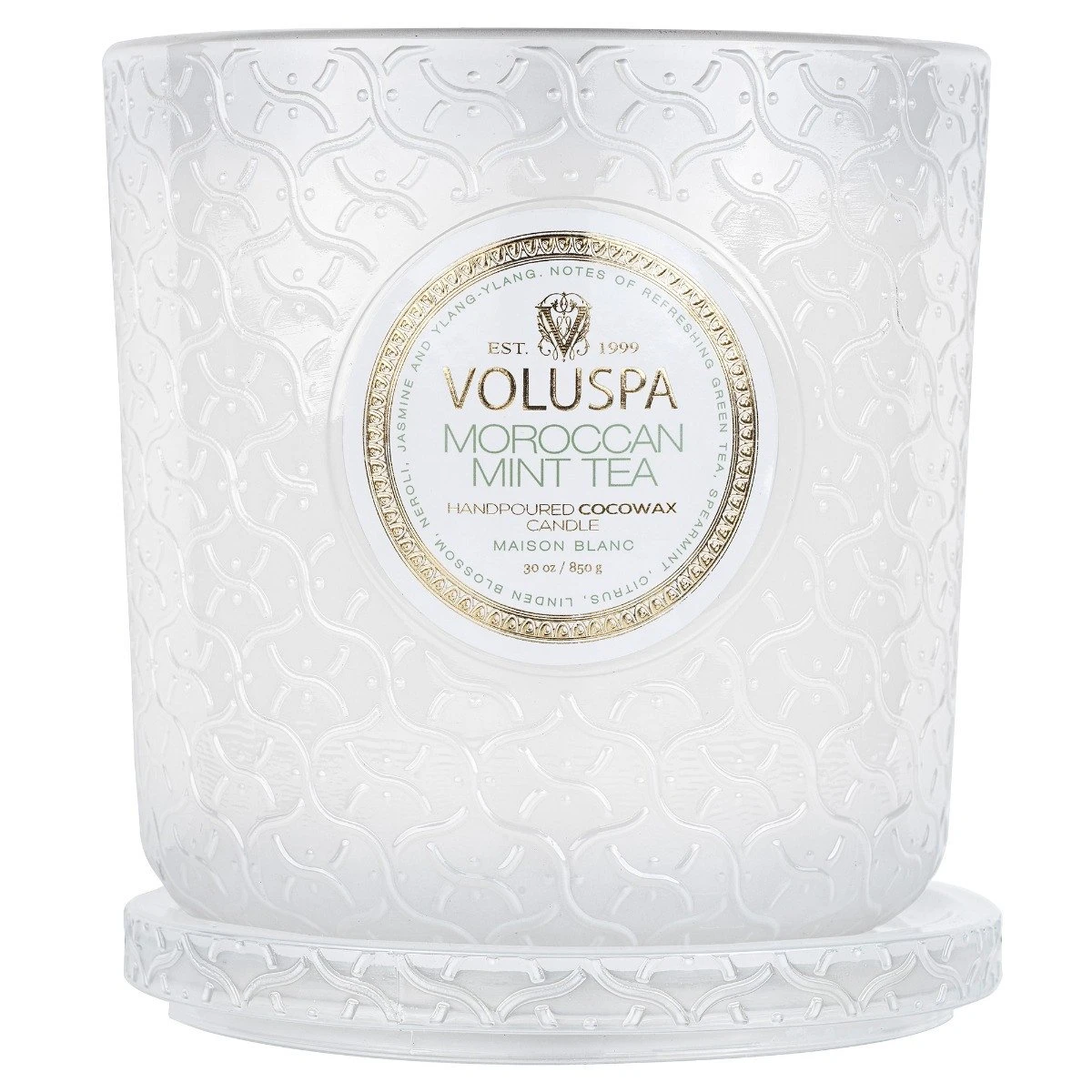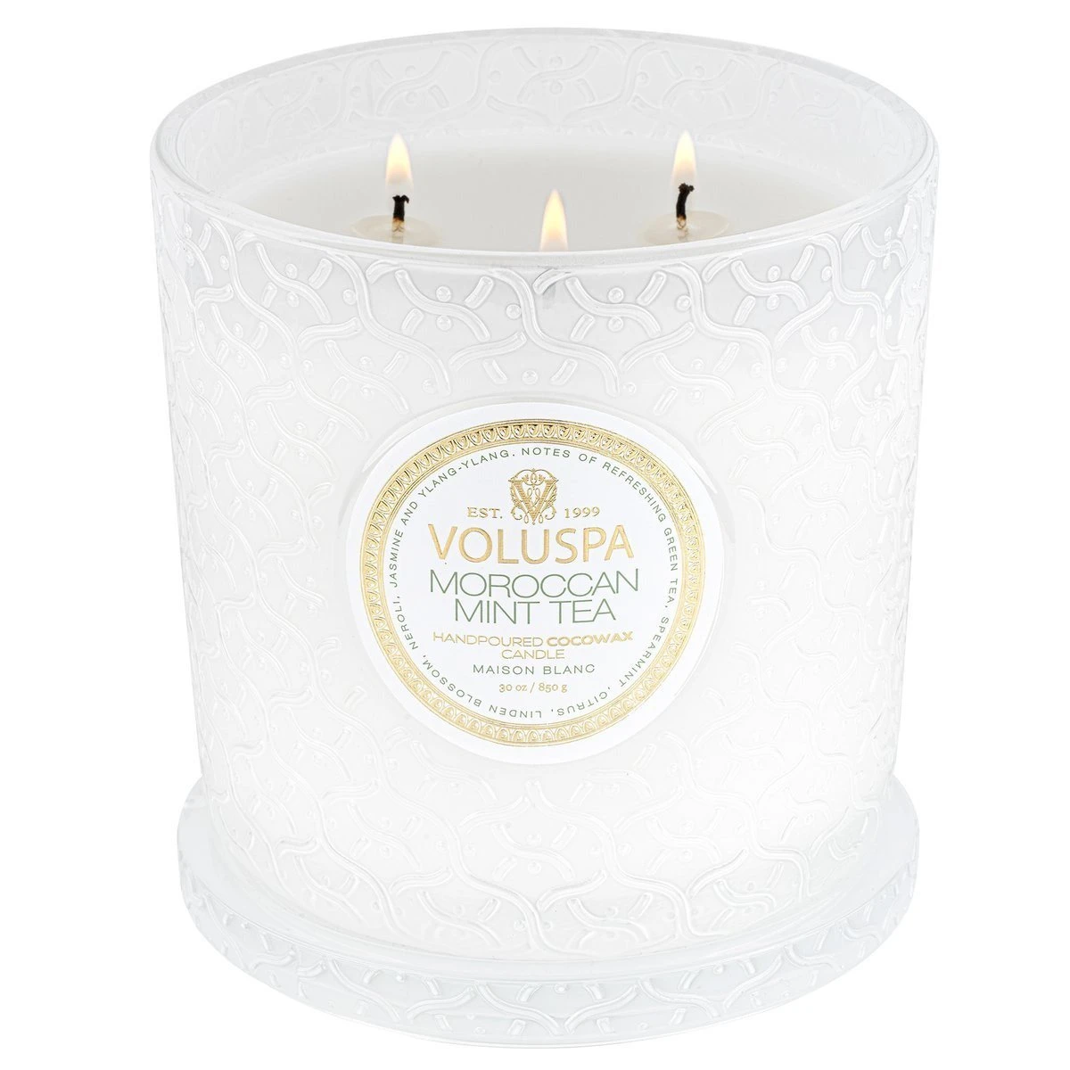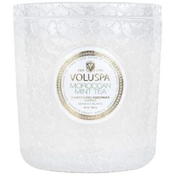 Voluspa Moroccan Mint Tea Luxe Candle: Welcome relief from the desert heat, Moroccan Mint Tea blends crisp, cool citrus and green spearmint with an intriguing floral heart of linden blossom, neroli, jasmine and ylang ylang. Instantly invite serenity with a hint of pleasant euphoria, the added infusion of gunpowder green tea, blackcurrant and effervescent ginger creates a breezy journey for armchair travelers and beyond.