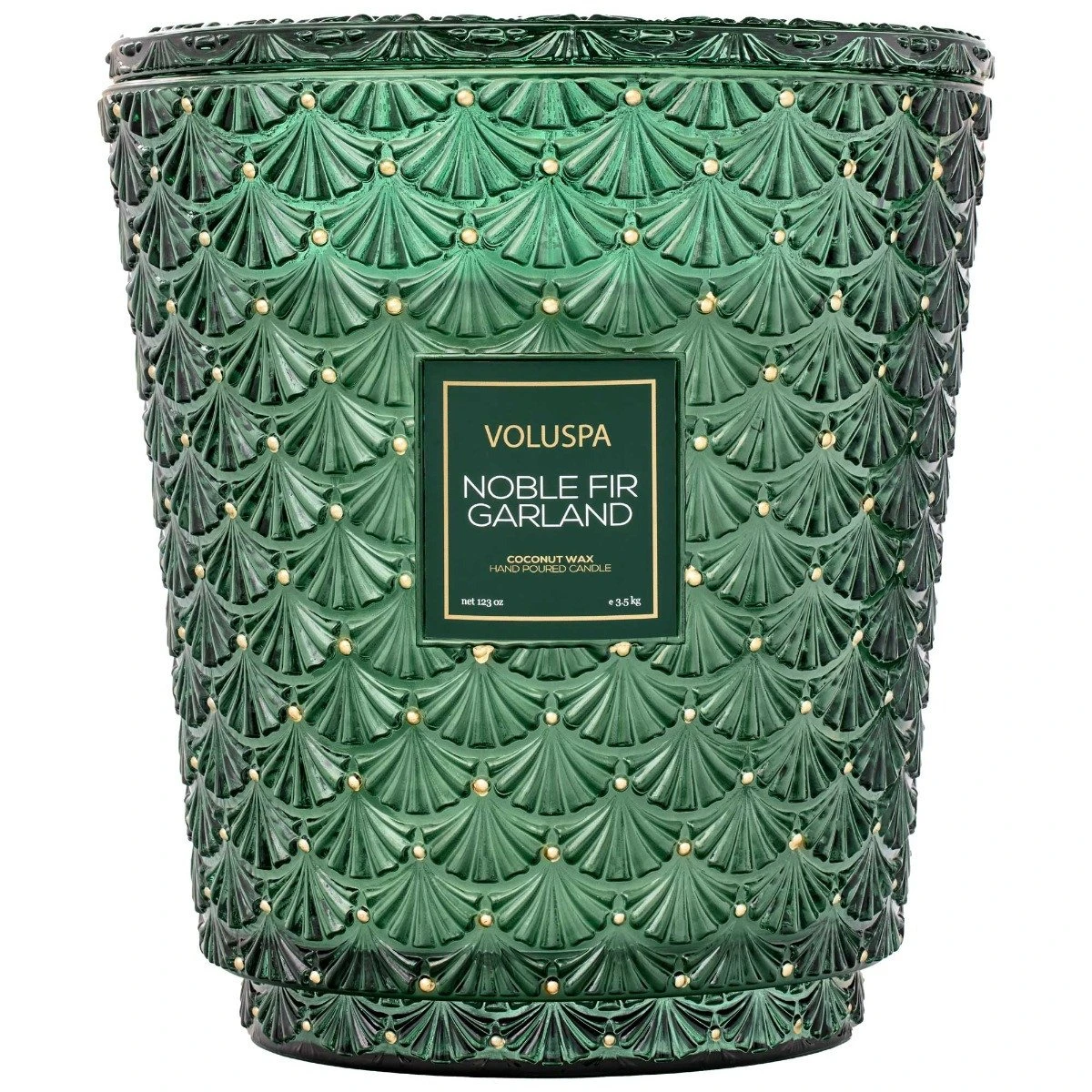 Voluspa Noble Fir Garland 5 Wick Hearth Candle: The clock strikes twelve and the house is still, glowing with anticipation for the festivities ahead. Enchanting emerald green and fresh rosemary garlands drape the warm fireplace. The centerpiece of celebration, the tree, reaches out with fragrant branches of Noble Fir and cedarwood, dusted with festive cardamom spice. Adorned in the spirit and sparkle of the holidays, a tapestry of cashmere musk and warm amber lights cast shadows dancing into the morning light. The Holidays have arrived!