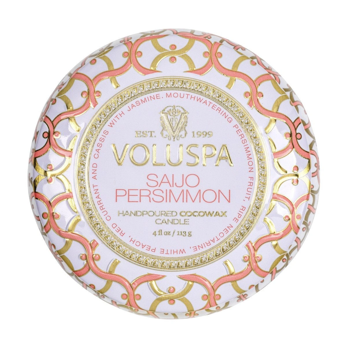 Voluspa Saijo Persimmon Mini Tin Candle is a sweet liaison of pulpy, fresh Persimmon engaging in a delicious flirtation with nectarine, peach, red currant and cassis. Billowing bouquets of white jasmine round this ultimate mouth-watering, scent. This fruity, fragrant fling has the makings of a passionate, long-lasting love story.