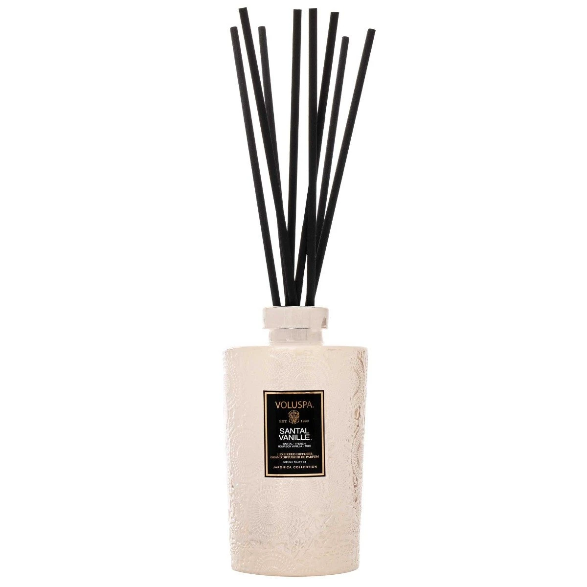 Designed using 8 wide gauge, black high absorbency reed sticks, the 500 ml larger-than-life Voluspa Luxe Reed Diffuser is perfect for larger spaces. Signature Japonica fragrances captured in elegantly embossed glass, for an always-on ambiance. Lasts up to 9 months.