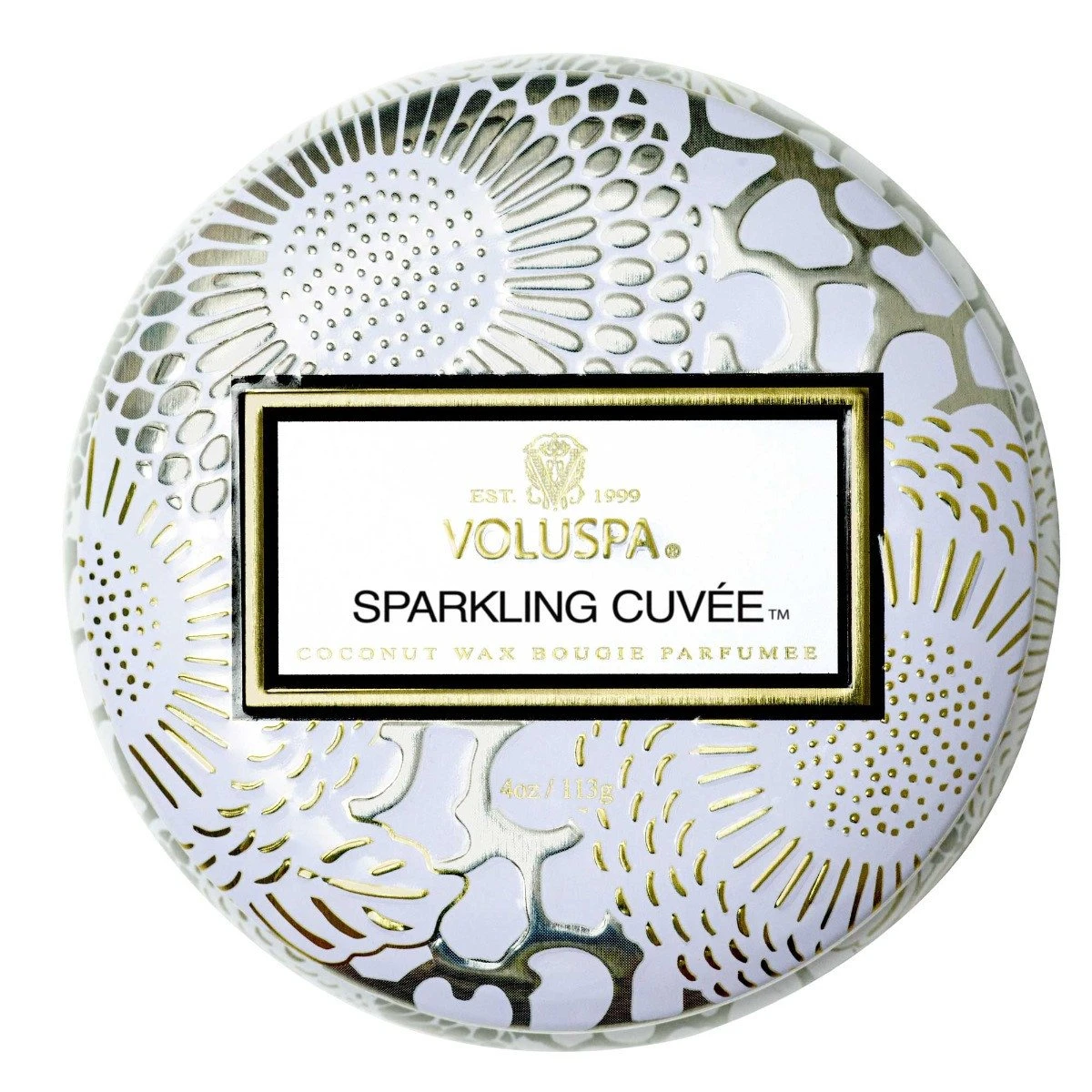 Voluspa Sparkling Cuvée Travel Tin Candle: Pop a bottle of Voluspa’s finest blend, it’s time to celebrate! The effervescence of sparkling wine is the heart of the celebration, with bubbles cascading to the surface. Raise a glass of Sparkling Cuvée, you rolfactory aperitif for every unforgettable occasion. Notes of sparkling wine, pomelo and woody oak.