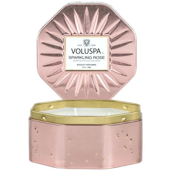Voluspa Sparkling Rose Octagon Tin Candle: Envision life through rose colored glasses with an effervescent cocktail of innocence and guile in a charming scent, bursting with the fizzy flash and sparkle of Pink Prosecco resting against the sweet purity of delicate, pink Rose Petals in a scent so disarmingly lovely that one is left giddy, enchanted and utterly intoxicated by its glistening beauty…