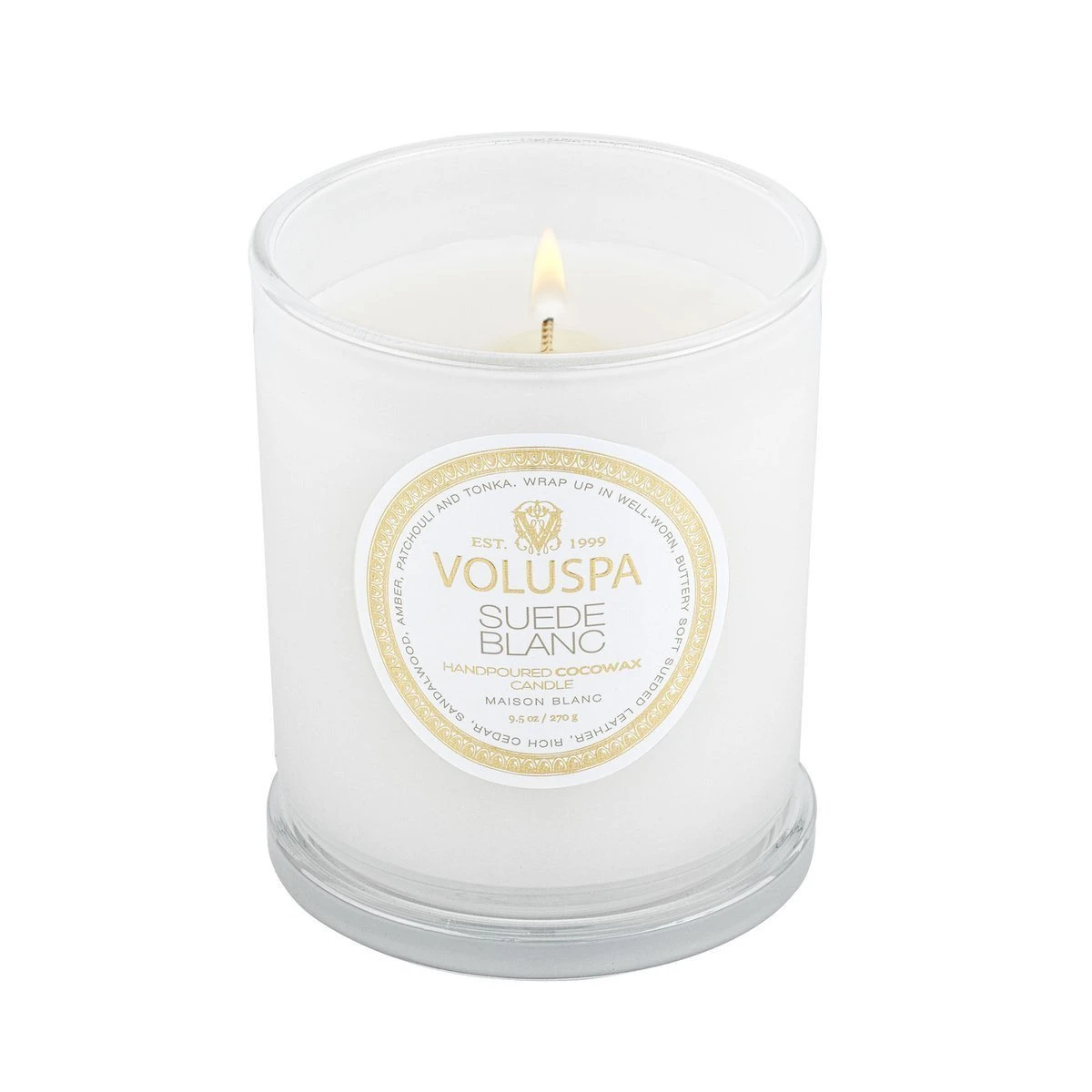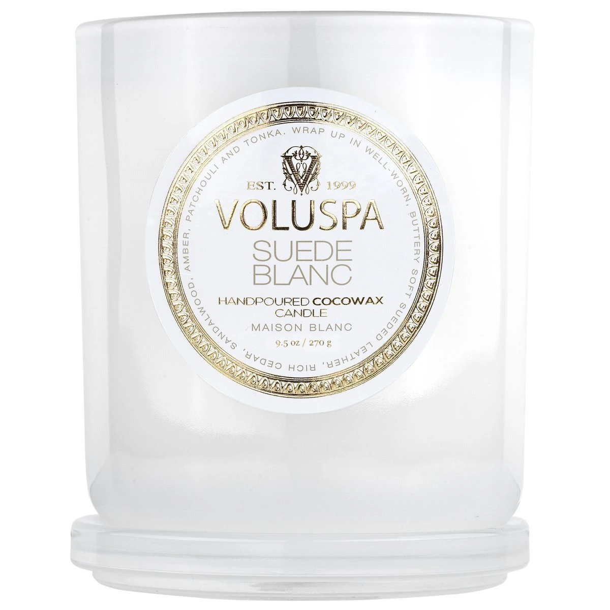 Voluspa Suede Blanc Candle: Wrap up in a comfortable jacket of soft, supple well-worn suede. Low-key, mellow and infinitely smooth…its sultry caress envelops all in a veil of smooth sensuality. Suede Blanc is the accessory that complements any style.