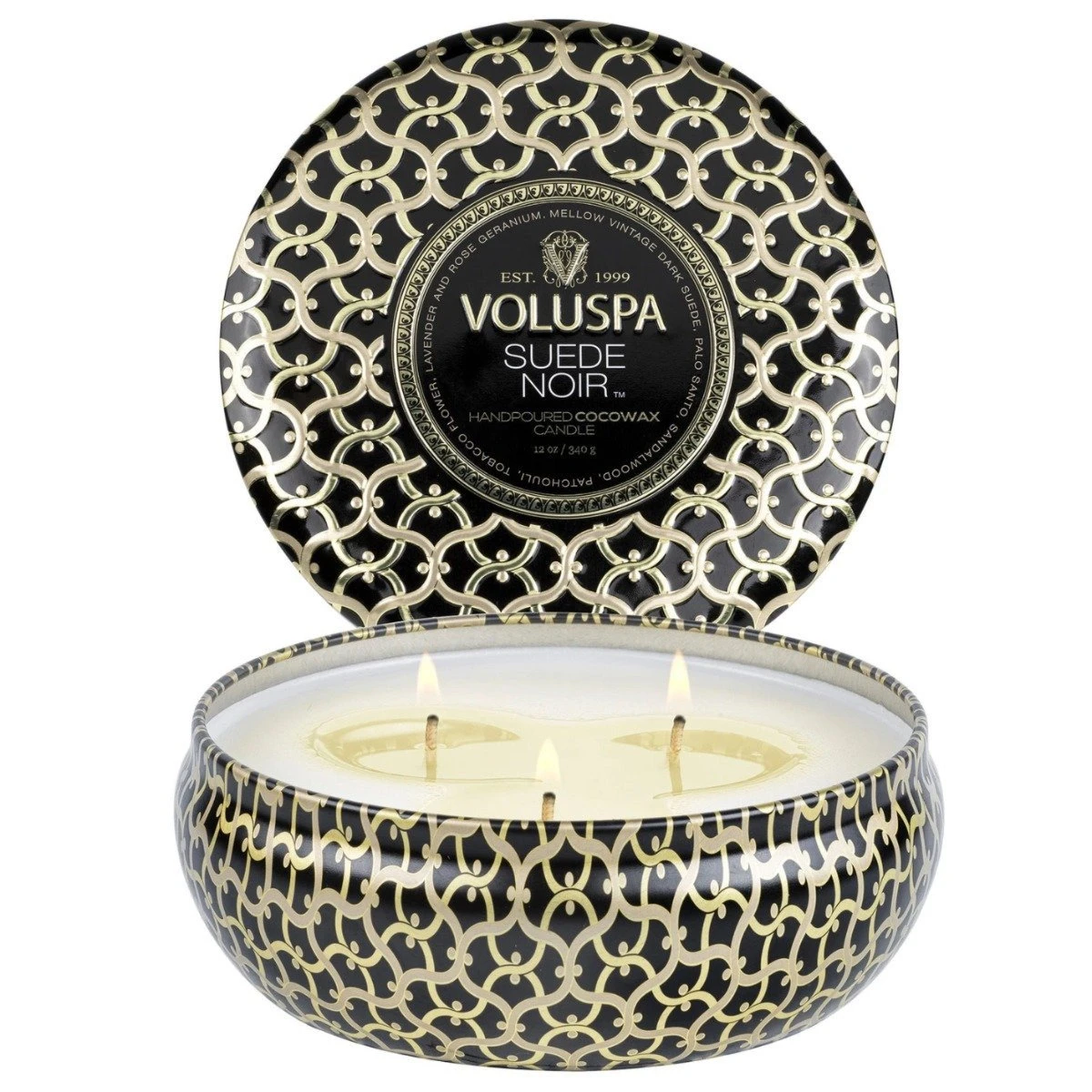 Voluspa Suede Noir 3 Wick Tin Candle is a shaded embrace in a lush excursion of complex, yet smooth sensuality. Creating a profusion of fleeting scents – Vintage Dark Suede, burning Palo Santo, traces of Patchouli, trails of smoky Hemp & Tobacco and the softly rising Vanilla moon – Suede Noir comes together delicately in a hushed, mellifluous voice, reminiscent of old vinyl records. Play it again and again.s delicious sparkling brut champagne mingled with hints of vanilla and barrel oak.