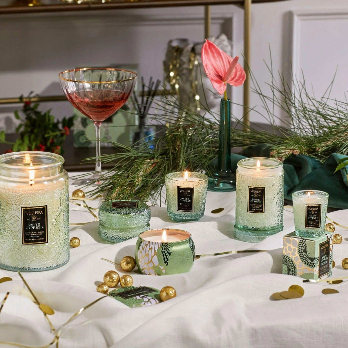 Voluspa White Cypress Candle is a classic yet contemporary Holiday scent, capturing a crisp walk in the winter woods. Frosted bergamot and minty snowdrops perfectly envelop freshly cut evergreen cypress boughs and snow-kissed sugar plum. Bask in its glow while cozy inside!