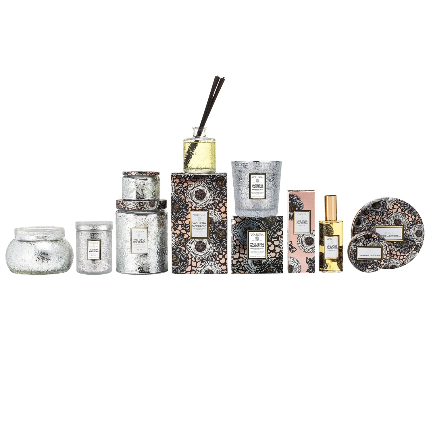 Voluspa’s unique coconut wax blend is hand-poured into a variety of vessels. Our candles are hand-poured in the United States and feature our proprietary, clean-burning coconut wax blend and 100% natural wicks. Our products are free of phthalates, pesticides, parabens and sulfates and are never tested on animals. Up-cycle these best sellers into keepsakes after the last burn. This fragrance collection includes (left to right): Chawan Bowl Candle, Small Jar Candle, Large Jar Candle, Petite Jar Candle, Reed Diffuser, Classic Candle, Room & Body Spray, Mini Tin Candle & 3 Wick Tin Candle.